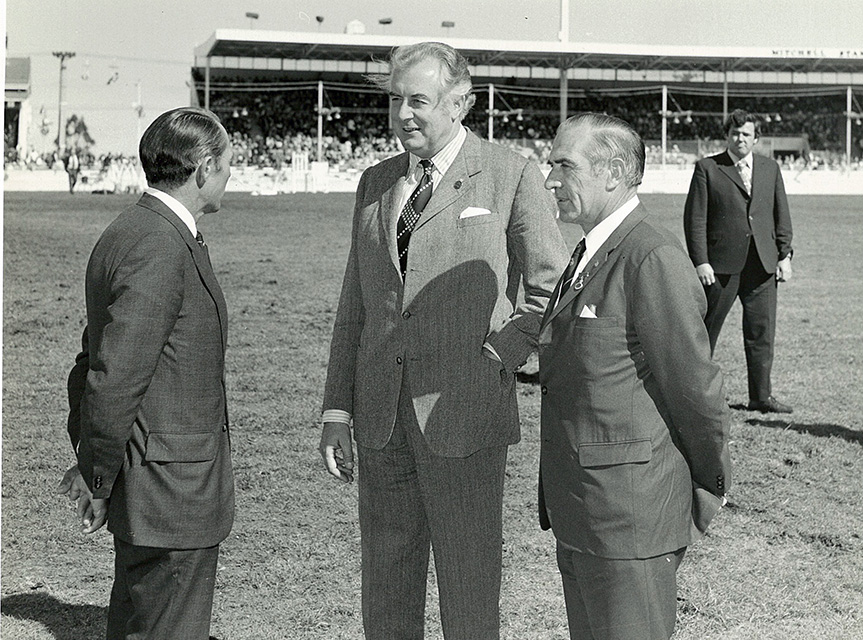 Prime Minister of Australia Gough Whitlam AC QC, President RASV Peter Ronald (left) and Ray Starritt in front of the Mitchell Stand at the Royal Melbourne Show in 1973.