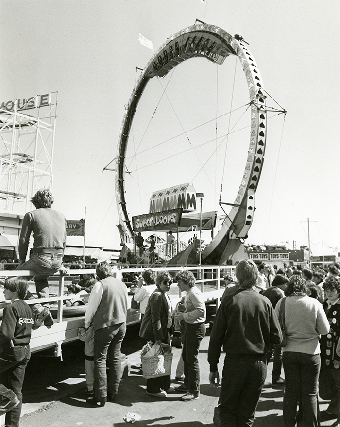 The turning head and wide mouth of a Laughing Clown is a recognisable symbol of Show amusements. Originating from Britain, the Laughing Clown was reportedly brought to Australia in the 1940s following their installation at the 1939/1940 New Zealand Centennial Exhibition. Like many amusements, Laughing Clowns have found themselves in many different areas around the Showgrounds over the years - in 2025, find some turning their watchful gaze between the Rural Pavilion and the Wave Swinger.